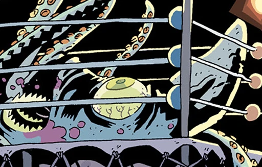 The space-squid from Rigel X-9 fought "Tusslin' Tom" Gurney in a wrestling match. At the precise moment that "Tusslin' Tom" won the match with a flying atomic elbow, forty-three children were born simultaneously around the world to mothers who had previously shown no signs of pregnancy.[1]